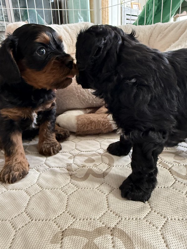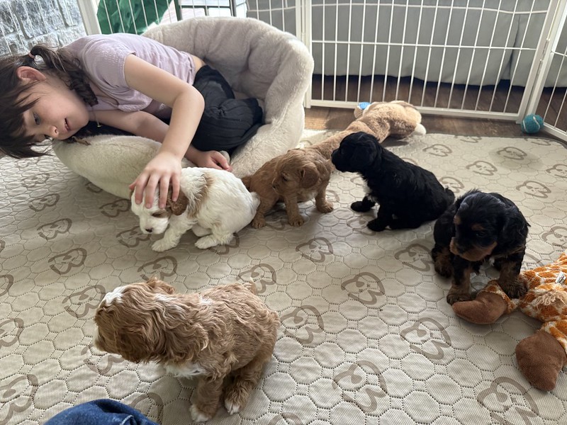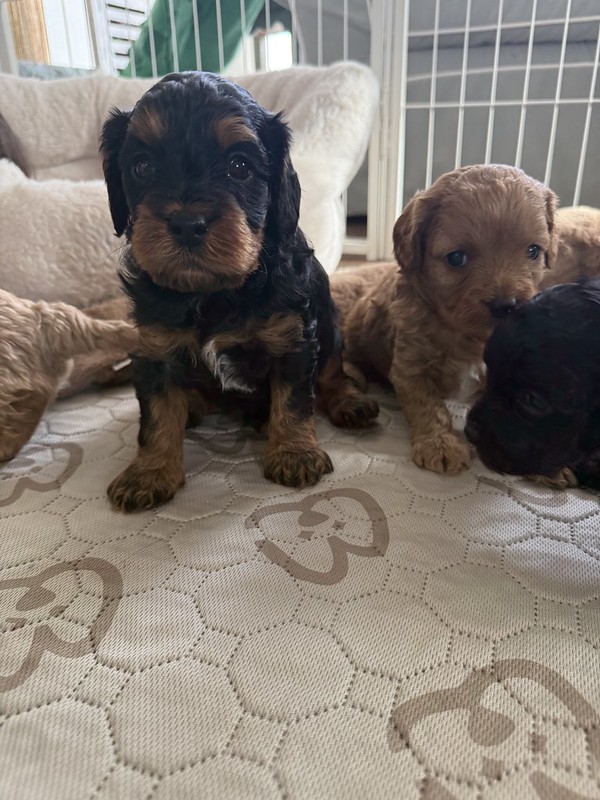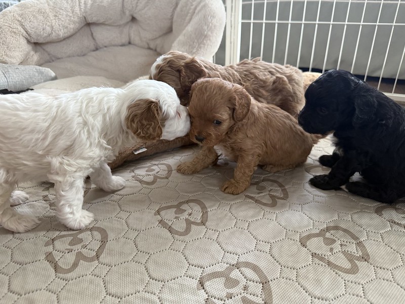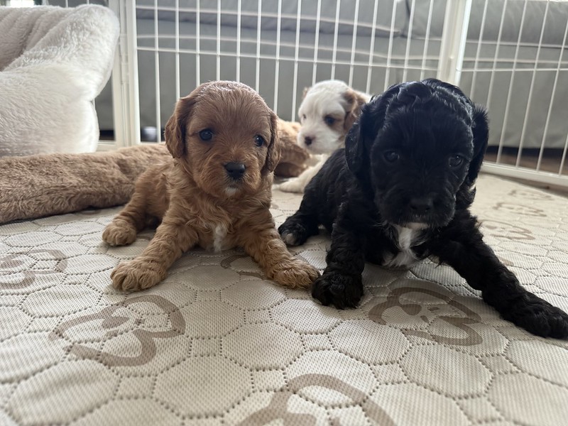 Reservations Available! Expected Weight 18-20lbs full grown. Ready April 21st Litter Reservations Tori & Jasper's LitterF1 Cavapoos - Some of the Colors we expect from this litter Interested in Reserving a puppy?Get Started NowClick here to get the process started. We ask that all potential owners fill out a brief application in order to verify some information we feel is important to know before we begin the reservation process :) Share